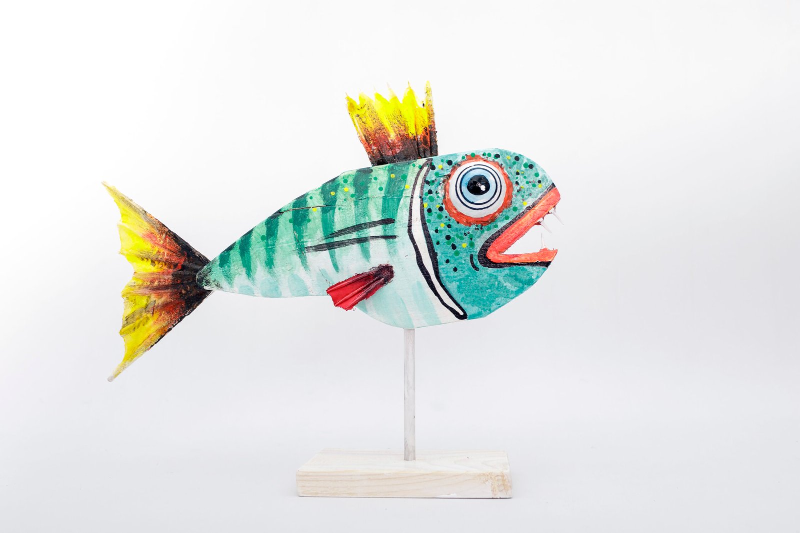 Bring the vibrancy of nature indoors with this unique handmade wood fish sculpture. Inspired by the lush wildlife of the Esmeralda River in Ecuador, this piece features striking green tones, a whimsical yellow crown-fin, and expressive details that add character to any shelf, desk, or mantelpiece.
